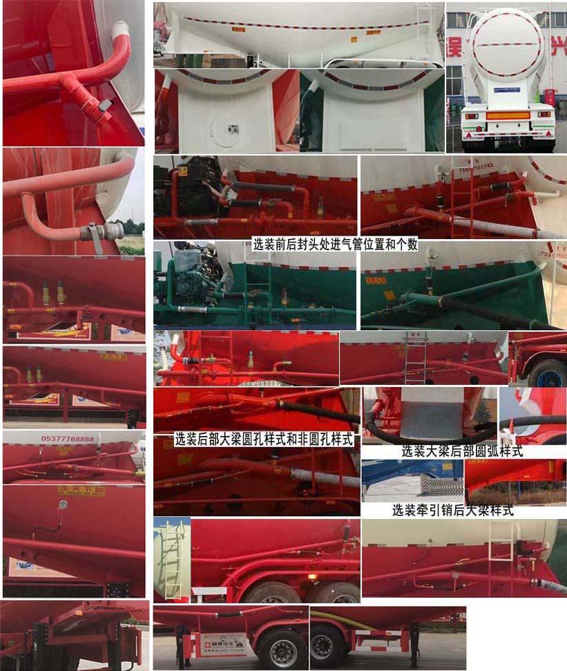 罐體總?cè)萘?29.2立方米,罐體有效容積:27.8立方米,運輸介質(zhì):固井專用水泥,介質(zhì)密度:1200千克/立方米;罐體外形尺寸罐體長(含封頭)8540mm,最大截面處寬2550mm,最大截面處高3040mm,最小封頭直徑為2010mm(選裝最小封頭直徑為1910mm),選裝罐體長(含封頭)為8050mm,最大截面處寬2550mm,最大截面處高3040mm,最小封頭直徑為2010mm(選裝最小封頭直徑為1910mm);選裝前部不加裝機組時整車長度(mm)為:8720,8300,選裝走臺樣式,選裝后組合燈樣式,選裝后組合燈所在部件樣式,選裝尾部標志板安裝位置,選裝號牌板安裝位置,選裝前位燈前回復反射器安裝位置及所在部件樣式,選裝前位燈樣式,選裝爬梯安裝位置(前部/側(cè)面/后部)和個數(shù)(一個/兩個/三個),選裝前后封頭處進氣管位置和個數(shù),選裝大梁圓孔樣式和非圓孔樣式,選裝大梁后部圓弧樣式,選裝牽引銷后大梁樣式,選裝空氣懸架,選裝后部大梁堵板樣式,選裝下出灰管道樣式,選裝管道樣式,選裝機組樣式,選裝外觀樣式;ABS系統(tǒng)生產(chǎn)廠家:廣州瑞立科密汽車電子股份有限公司,梁山順安達汽車科技有限公司,廣州市西合汽車電子裝備有限公司,山東梁山德爾福汽車科技有限公司,型號:CM2XL-4S/2M,SAD-ABS4S/2M,XH-GQ4S2M-E01,DEF-ABS4S/3M;側(cè)面及后下部防護裝置所用材料材質(zhì)為:鋁合金,側(cè)面及后下部防護裝置與車輛連接方式均為:螺栓連接,后部防護裝置的主要尺寸參數(shù):斷面尺寸(mm)為120×68,離地高度為:500mm,選裝側(cè)面及后下部防護裝置所用材料材質(zhì)為:Q235,與車架連接方式均為焊接或螺栓連接; 頂部封閉不可開槽,后部不可開啟;車長/牽引銷到車輛最前端距離/軸距/后懸對應關系為:9500/1230/4800+1310+1310/850,9500/1470/4560+1310+1310/850,9500/1470/4370+1310+1310/1040,8720/450/4800+1310+1310/850,8720/960/4370+1310+1310/770,8300/540/4370+1310+1310/770,8720/690/4560+1310+1310/850,8720/770/4560+1310+1310/770,8720/530/4800+1310+1310/770. |