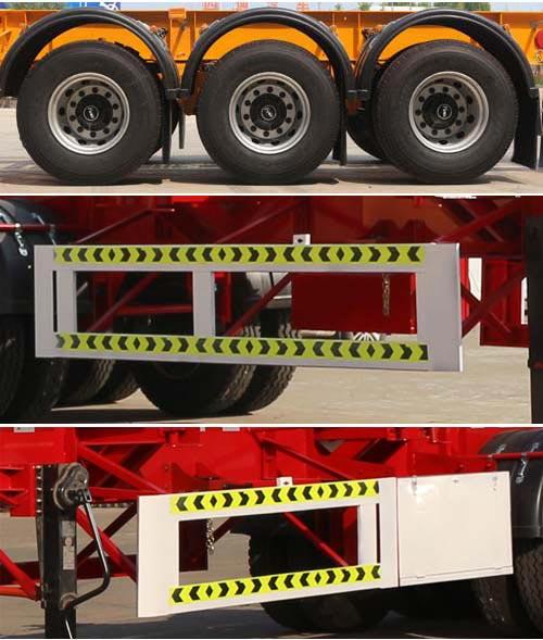 用于運輸一個40英尺集裝箱,牽引銷處車架高度為90mm,選裝牽引銷大梁高度為:120mm,150mm,170mm,180mm,190mm,194mm;選裝尾部標志板安裝位置,選裝正后樣式,選裝號牌板安裝位置,選裝車輛前部不加裝擋向塊,選裝后部燈具安裝位置,選裝輪罩樣式,選裝側(cè)防護樣式;ABS系統(tǒng)生產(chǎn)廠家:廣州瑞立科密汽車電子股份有限公司,梁山順安達汽車科技有限公司,廣州市西合汽車電子裝備有限公司,山東梁山德爾福汽車科技有限公司,型號:CM2XL-4S/2M,SAD-ABS4S/2M,XH-GQ4S2M-E01,DEF-ABS4S/3M ;側(cè)面及后下部防護裝置所用材料材質(zhì)均為:Q235,側(cè)面防護裝置與車輛連接方式為:螺栓連接,后部防護裝置與車輛連接方式為:焊接,后部防護裝置的主要尺寸參數(shù):斷面尺寸(mm)為140×40,離地高度為:480mm. |