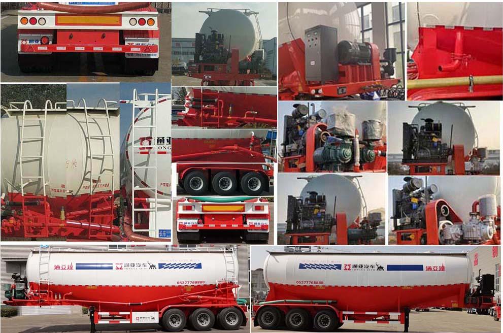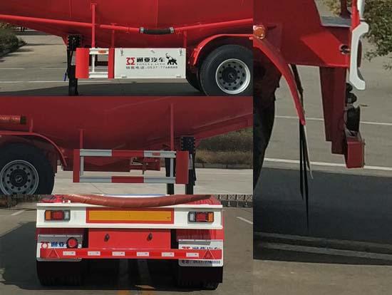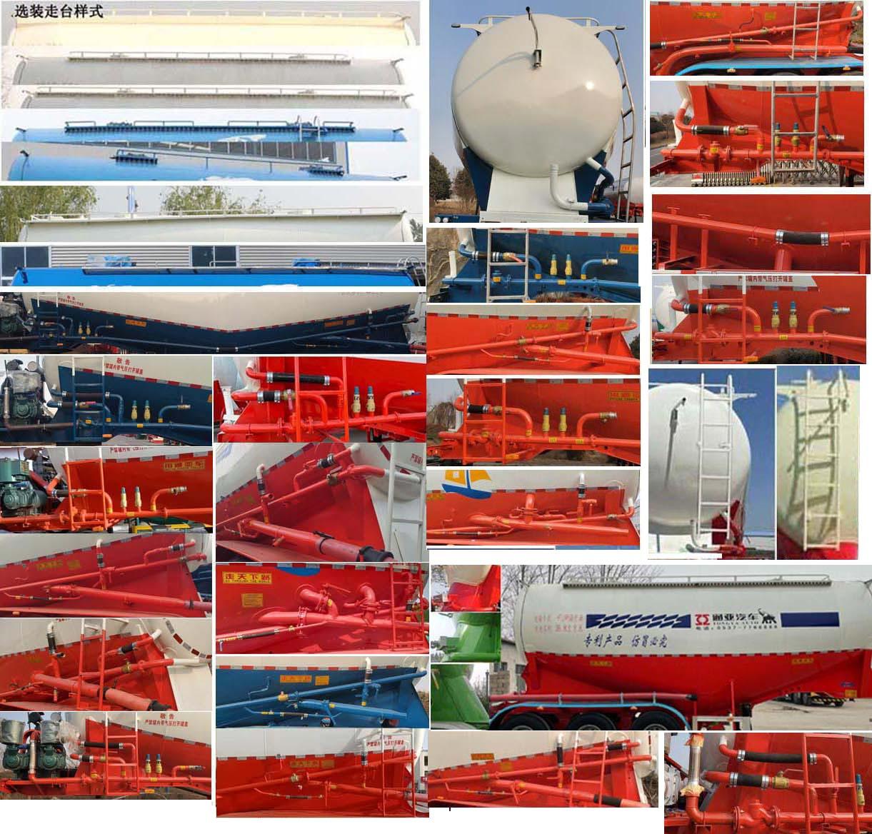 頂部封閉不可開槽,后部不可開啟;罐體總?cè)萘?46.8立方米,罐體有效容積:44.5立方米,運輸介質(zhì):干煤灰;罐體外形尺寸罐體長(含封頭)10000mm,最大截面處寬2550mm,最大截面處高3180mm,前后封頭直徑為2010mm(選裝前后封頭直徑為1910mm),選裝罐體長(含封頭)為9800mm,最大截面處寬2550mm,最大截面處高3200mm,前后封頭直徑為2010mm(選裝前后封頭直徑為1910mm),選裝走臺樣式,選裝后組合燈樣式,選裝前位燈樣式,選裝爬梯安裝位置及個數(shù)(一個/兩個/三個),選裝前后封頭處進氣管位置和個數(shù),選裝大梁圓孔樣式和非圓孔樣式,選裝大梁后部圓弧樣式,選裝牽引銷后大梁樣式,選裝管道樣式,選裝外觀樣式,選裝雙助吹樣式,選裝支腿連接件樣式,選裝外接氣源樣式,選裝壓力表安裝位置,選裝尾部標志板安裝位置,選裝號牌板安裝位置,選裝機組樣式,選裝前后支梁樣式,選裝爬梯樣式及踏板樣式,選裝雙邊支梁結(jié)構(gòu);ABS系統(tǒng)生產(chǎn)廠家:廣州瑞立科密汽車電子股份有限公司,梁山順安達汽車科技有限公司,廣州市西合汽車電子裝備有限公司,型號:CM2XL-4S/2M,SAD-ABS4S/2M,XH-GQ4S2M-E01;側(cè)面及后下部防護裝置所用材料材質(zhì)為:Q235,側(cè)面及后下部防護裝置與車輛連接方式均為:螺栓連接或焊接,后部防護裝置的主要尺寸參數(shù):斷面尺寸(mm)為120×68,離地高度為:500mm;