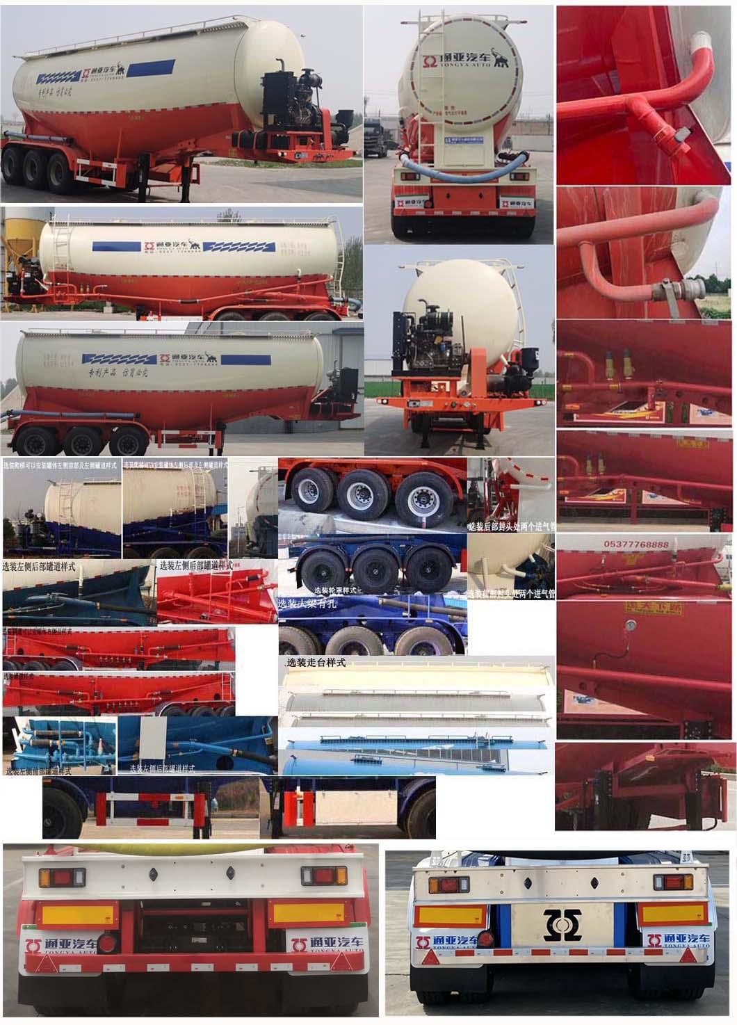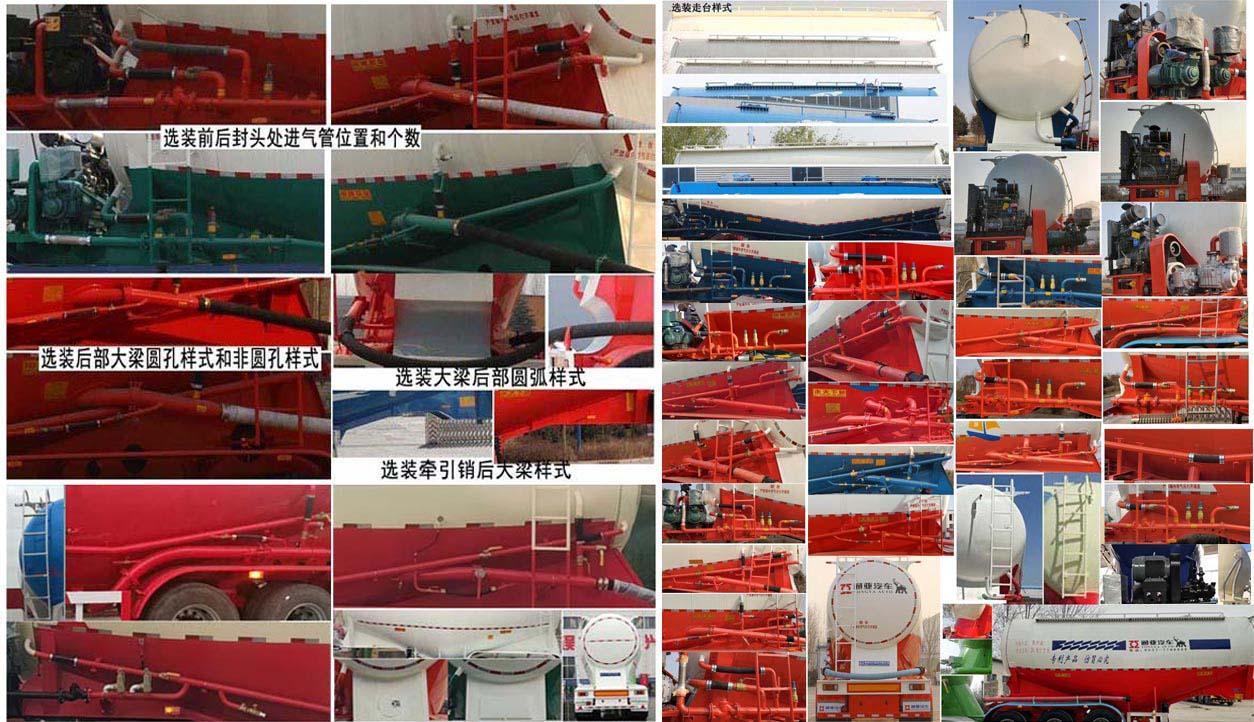 | 其它 | 罐體總?cè)萘繛?40立方米,罐體有效容積:38.2立方米,運輸介質(zhì):粉煤灰,介質(zhì)堆密度:830千克/立方米,罐體尺寸(不含封頭)長:8750mm,最大截面高度:3180mm,最大寬度:2490mm,選裝車輛前部不加裝機組,不帶機組時外形尺寸為(mm):9700×2500×3990,選裝雙助吹樣式,選裝支腿連接件樣式,選裝外接氣源樣式,選裝壓力表安裝位置,選裝大梁后部可以為弧形,選裝爬梯的安裝位置可以在罐體左側(cè)前部或后部或罐體后部,爬梯個數(shù)可以為一個或兩個或三個,選裝輪罩樣式及鋁合金輪轂,選裝走臺樣式,選裝罐頂升降護(hù)欄,頂部可為擋水槽式也可為走臺式,選裝前后封頭處進(jìn)氣管位置和個數(shù),工具箱位置可選裝,選裝罐蓋個數(shù)及位置,選裝罐體罐道的樣式,選裝大梁可以為鉆孔樣式,選裝輪罩樣式,選裝前后封頭處進(jìn)氣管位置和個數(shù),選裝大梁圓孔樣式和非圓孔樣式,選裝大梁后部圓弧樣式,選裝牽引銷后大梁樣式,選裝下出料樣式,選裝后尾小工具箱樣式,選裝側(cè)面管道樣式,選裝機組樣式,選裝部件位置因為制造誤差可有小變化;車長為10420mm時,軸距為;5550+1310+1310,5730+1310+1310,前懸/后懸:-/820;車長為9700mm時,軸距為;5550+1310+1310,5730+1310+1310,前懸/后懸:-/820;ABS系統(tǒng)生產(chǎn)廠家:威伯科汽車控制系統(tǒng)(中國)有限公司,廣州瑞立科密汽車電子股份有限公司,梁山順安達(dá)汽車科技有限公司,山東梁山德爾福汽車科技有限公司,型號:4005000810 4S2M,CM2XL-4S/2K(4S/2M),SAD-ABS4S/2M,DEF-ABS4S/3M;側(cè)面及后下部防護(hù)裝置所用材料材質(zhì)為:Q235,側(cè)面及后下部防護(hù)裝置與車輛連接方式均為:螺栓連接或焊接,后部防護(hù)裝置的主要尺寸參數(shù):斷面尺寸(mm)為120×68,離地高度為:500mm.頂部封閉不可開槽,后部不可開啟,選裝罐體樣式可以為雙倉或單倉,選裝燈具型號及后組合燈所在部件的樣式,選裝后部大梁可以為弧形,選裝尾部標(biāo)志板安裝位置,選裝號牌板安裝位置. | ||