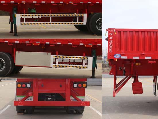 卸貨方式為:側卸;安裝有手動鎖緊機構;選裝前擋樣式,選裝側面樣式,選后組合燈為矩形樣式,選裝后霧燈圓形樣式,選裝尾部標志板安裝位置,每側可選4扇門,5扇門,6扇門,選裝欄板結構為下開門,吊開門結構,橫瓦楞,豎瓦楞,方管十字花樣式,選裝前檔板結構,選裝側面樣式,選裝后部樣式,立柱可選內插,外插樣式;ABS系統(tǒng)生產廠家:廣州瑞立科密汽車電子股份有限公司,梁山順安達汽車科技有限公司,廣州市西合汽車電子裝備有限公司,型號:CM2XL-4S/2M,SAD-ABS4S/2M,XH-GQ4S2M-E01;側面及后下部防護裝置所用材料材質為:Q235,側面及后下部防護裝置與車輛連接方式均為焊接,后部防護裝置的主要尺寸參數(shù):斷面尺寸(mm)為140×50,離地高度為:480mm;車長/牽引銷到車輛最前端距離/軸距/后懸對應關系為:13000/1200/6880+1310+1310/2300,13000/1300/6780+1310+1310/2300,13000/1400/6680+1310+1310/2300,12500/1300/6480+1310+1310/2100,12000/1200/6380+1310+1310/1800.